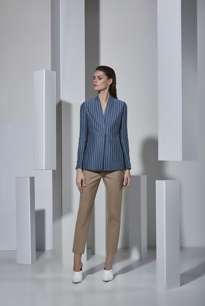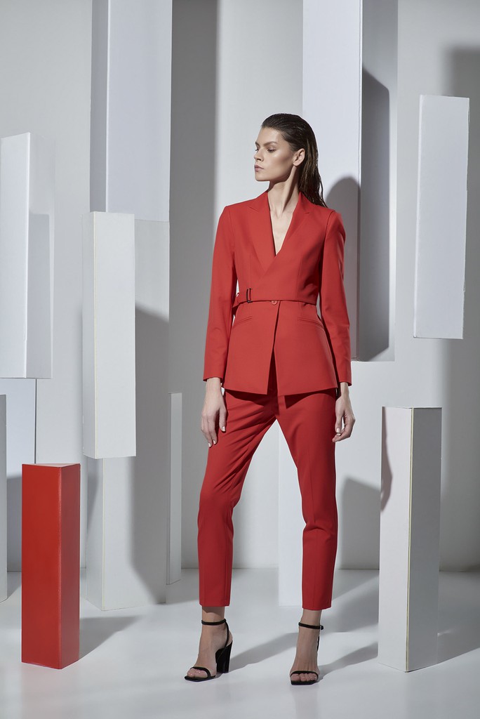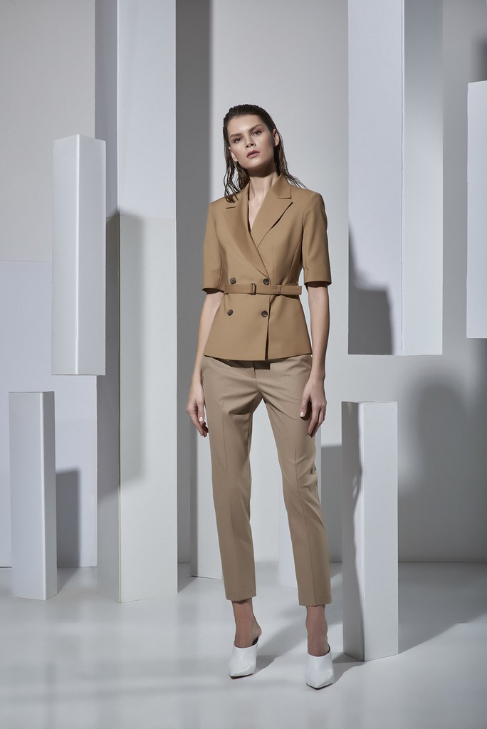 Основной акцент в коллекции сделан на актуальные в новом сезоне костюмные группы из натуральных и смесовых тканей. В центре внимания – большое разнообразие жакетов: однобортные, двубортные, удлиненные и укороченные, с элементами спортивной эстетики и милитари, с карманами, кулисками и декоративными лампасами.