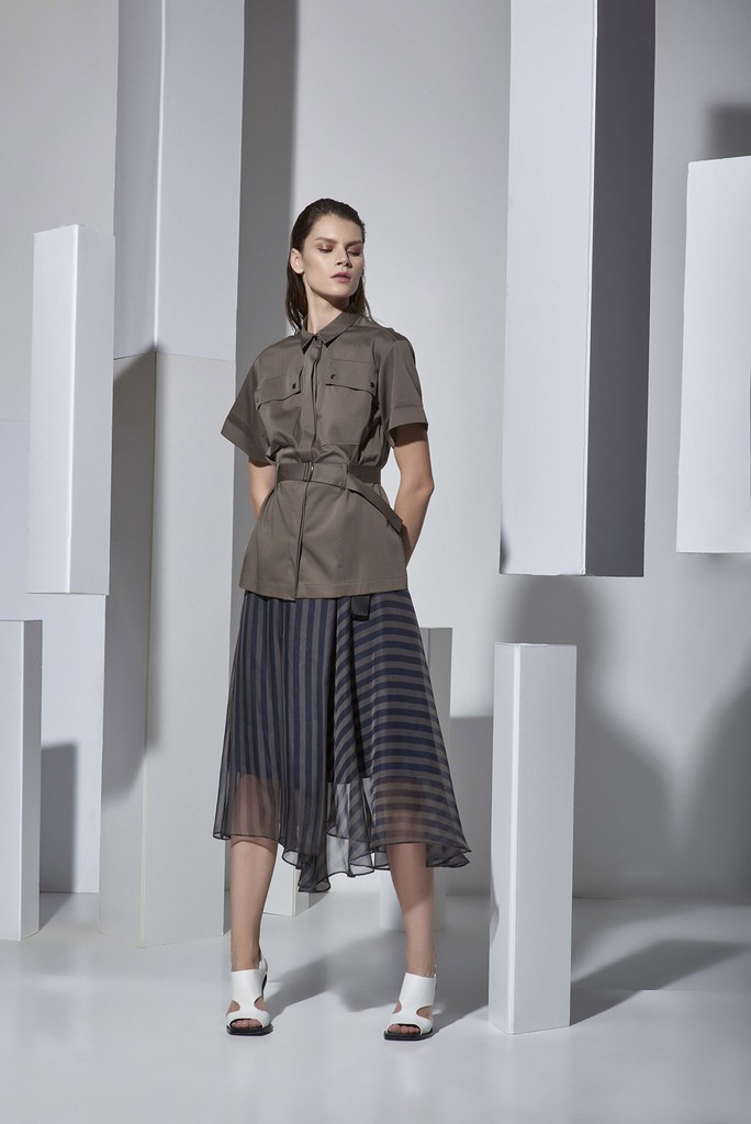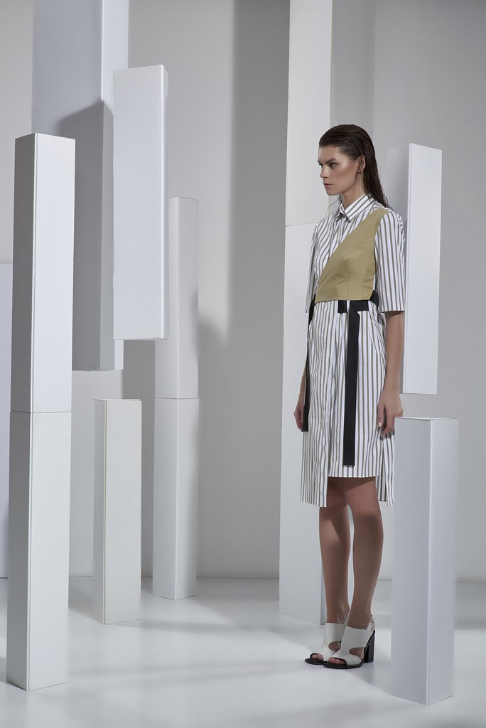 Новые летние капсулы – легкие костюмы, платья-рубашки прямых и приталенных силуэтов, с отстегивающимися юбками, асимметричными деталями из стрейчевых хлопковых тканей в полоску.