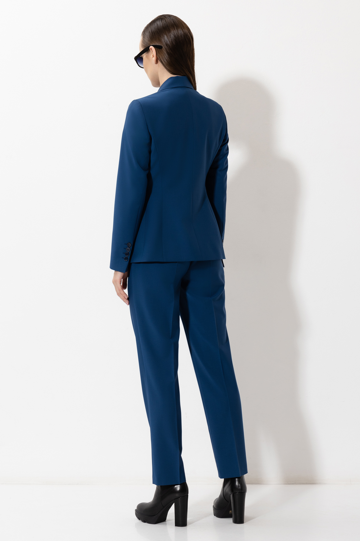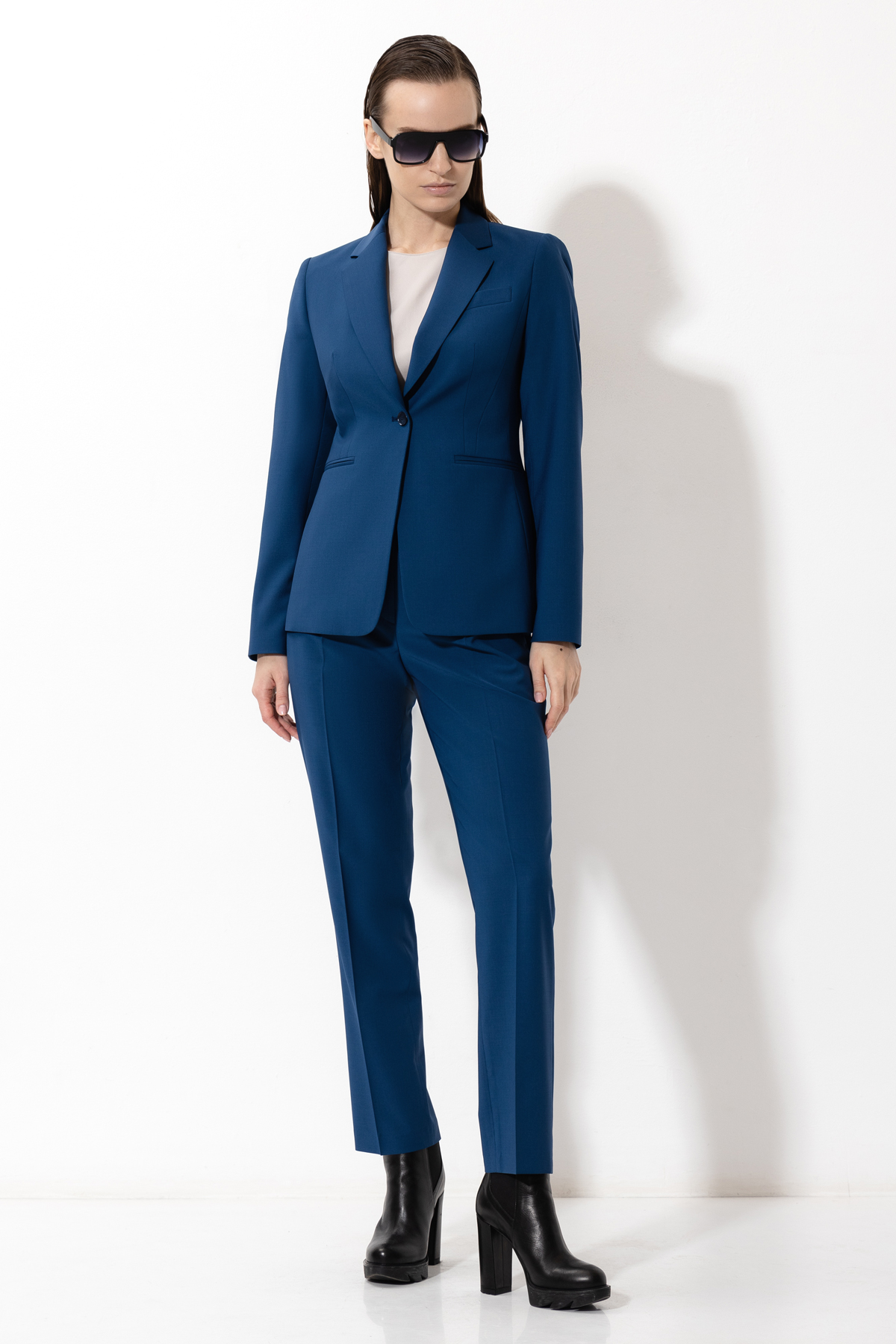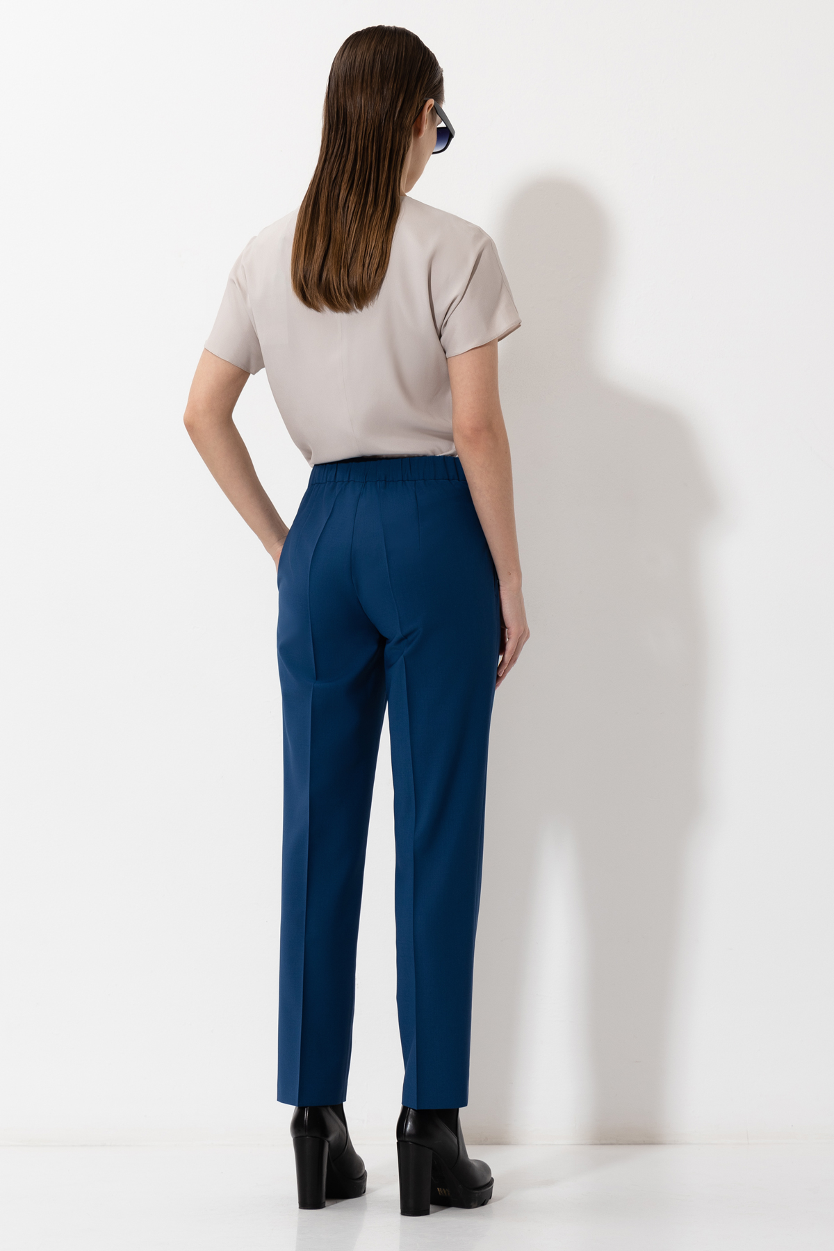 Зауженные брюки из костюмной ткани с добавлением шерсти. Материал хорошо держит форму и не мнется. Модель дополнена мягким, эластичным поясом на резинке, стрелками и боковыми карманами.