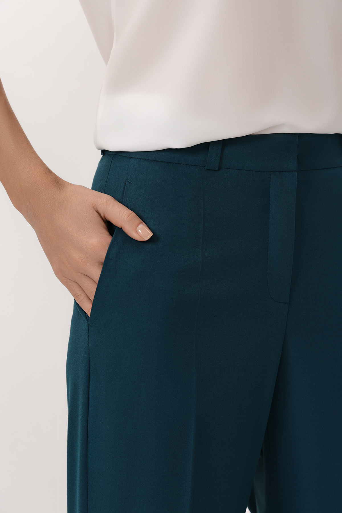 Брюки из смесовой ткани с добавлением вискозы. Изделие дополнено боковыми карманами, стрелками и мягким поясом со шлевками, что позволяет носить брюки с ремнем. Застежка на молнию и металлический крючок.