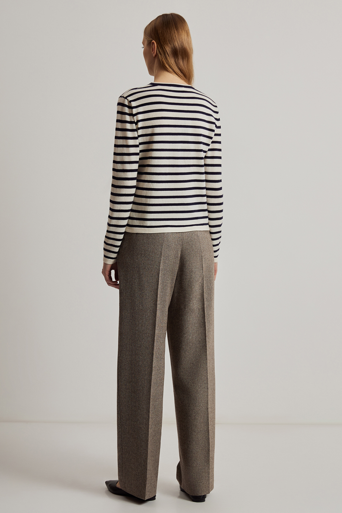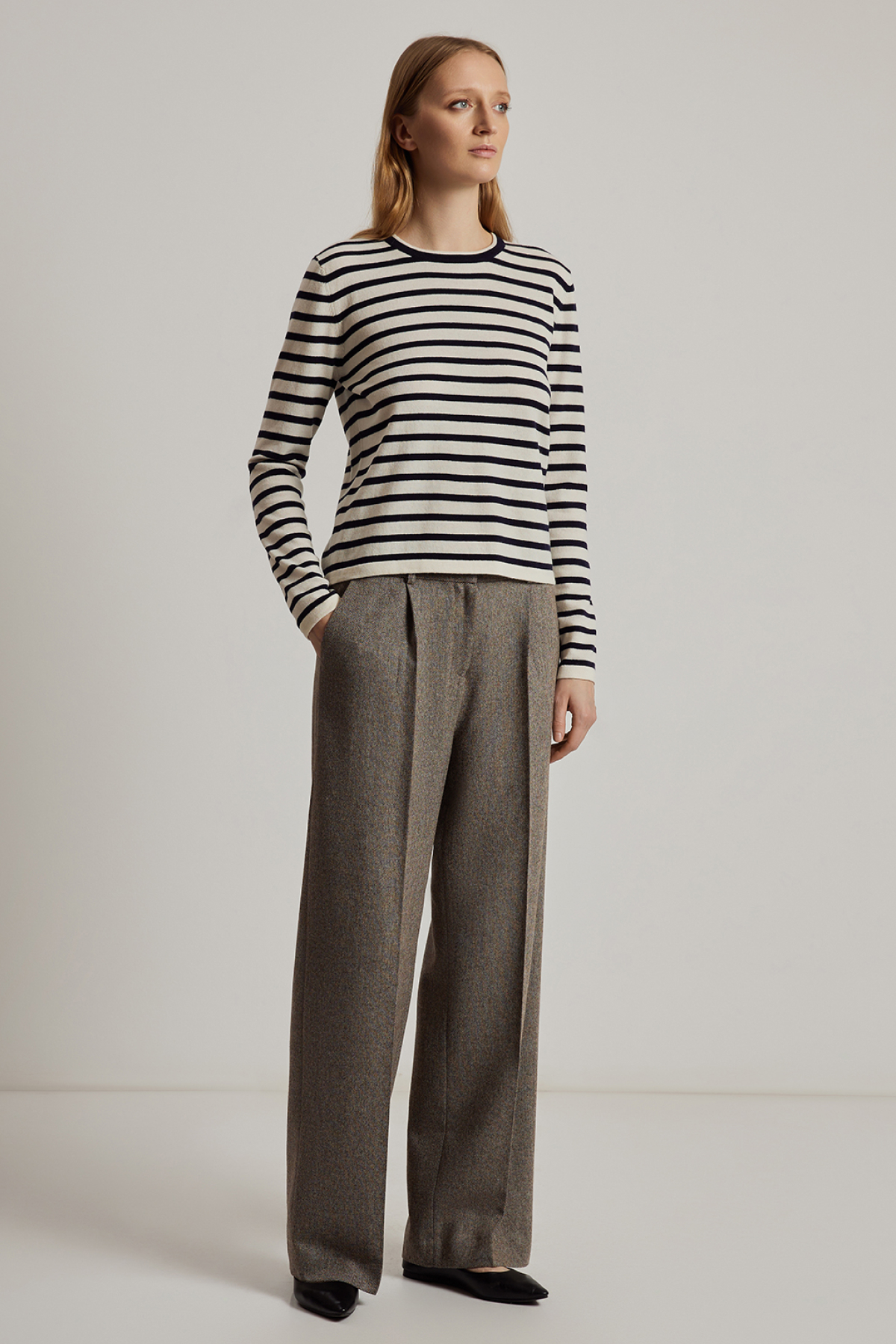 Джемпер свободного силуэта с принтом в горизонтальную полоску, выполненный из 100% дышащей шерсти.