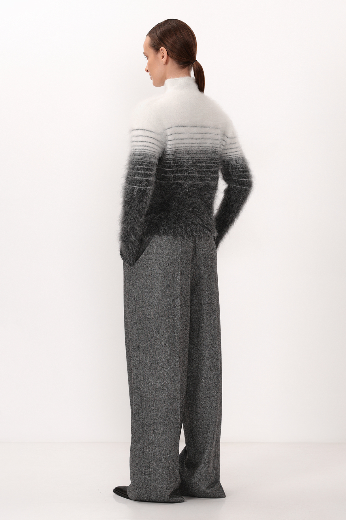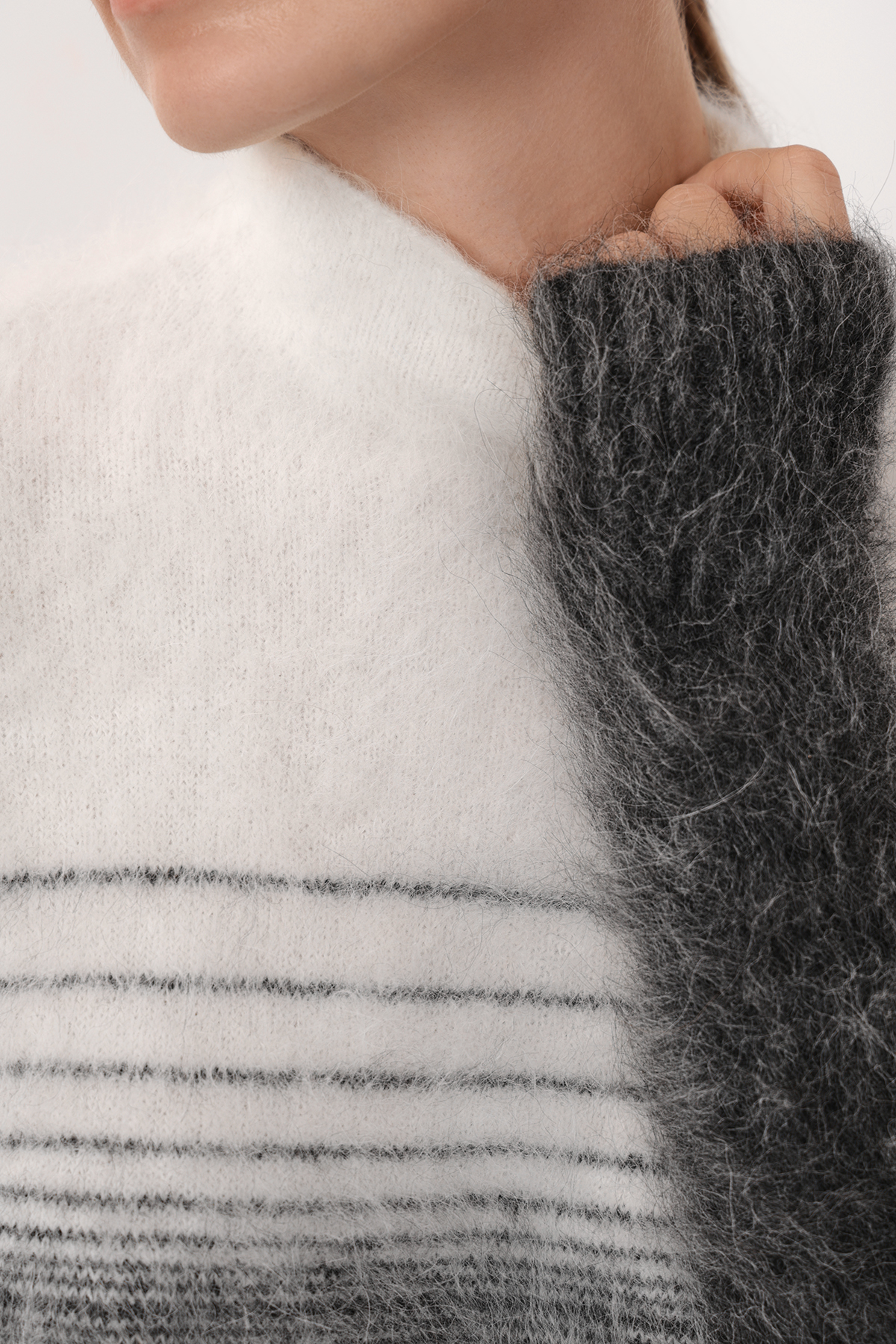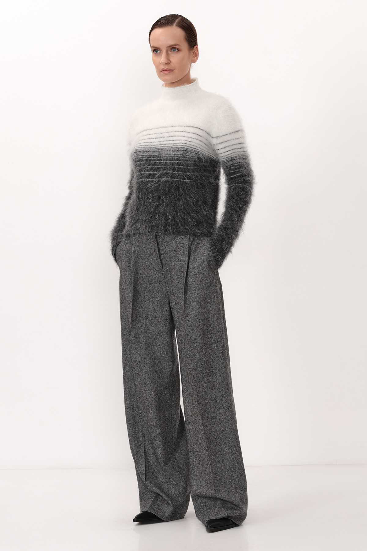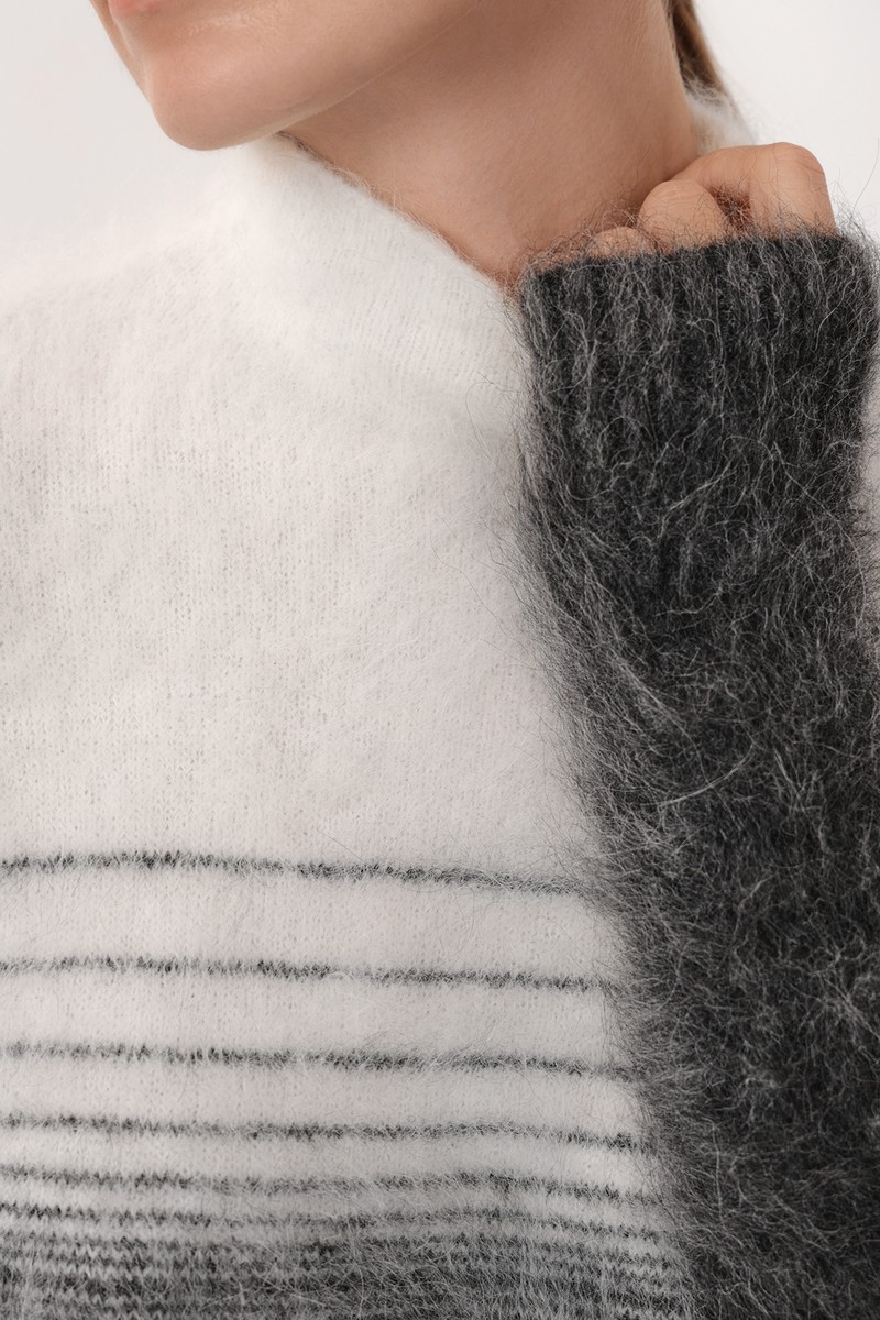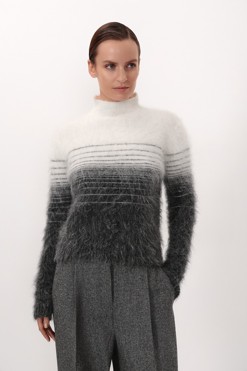 Трикотажный джемпер с градиентом и принтом в полоску. Модель прямого силуэта выполнена из тактильно приятного материала на основе шерсти альпаки.