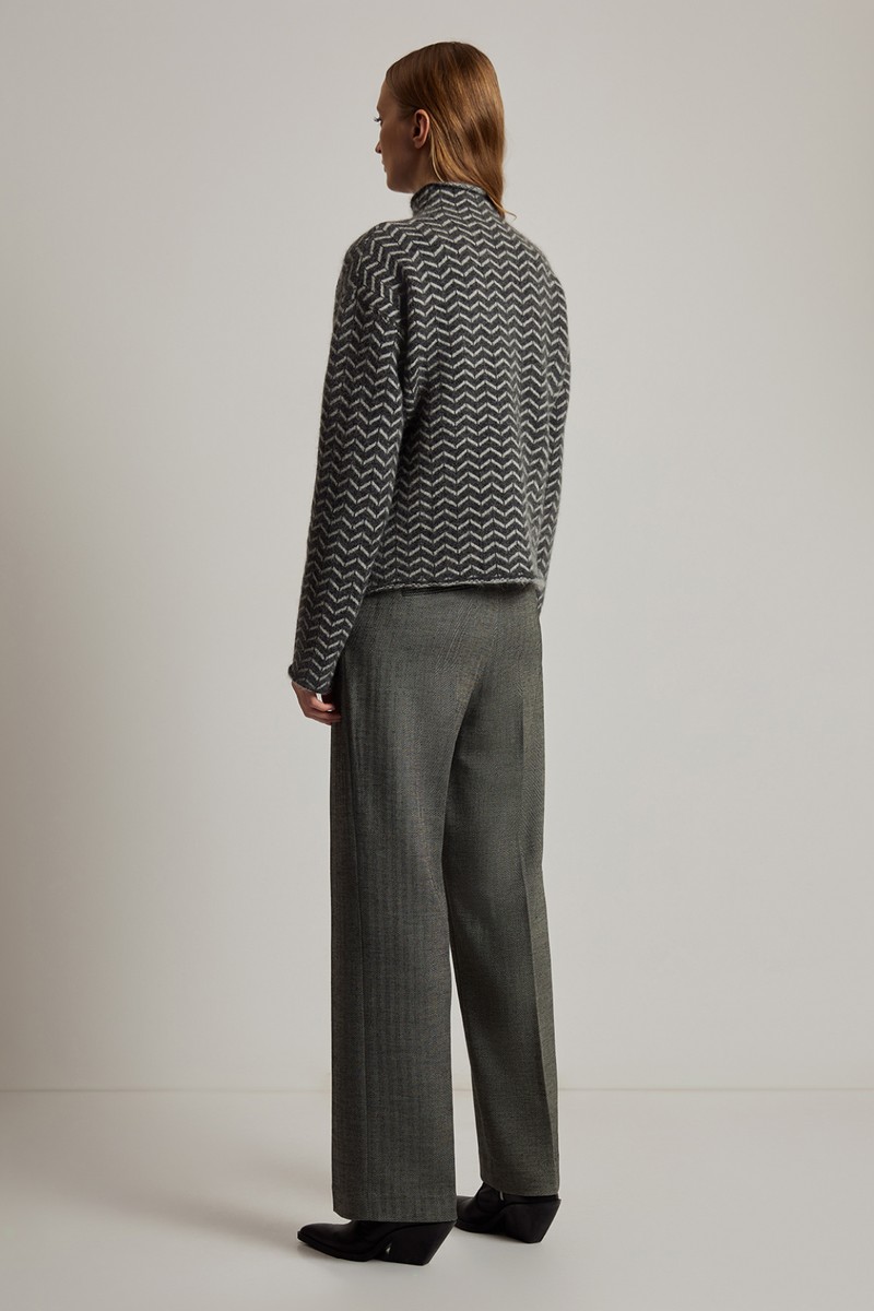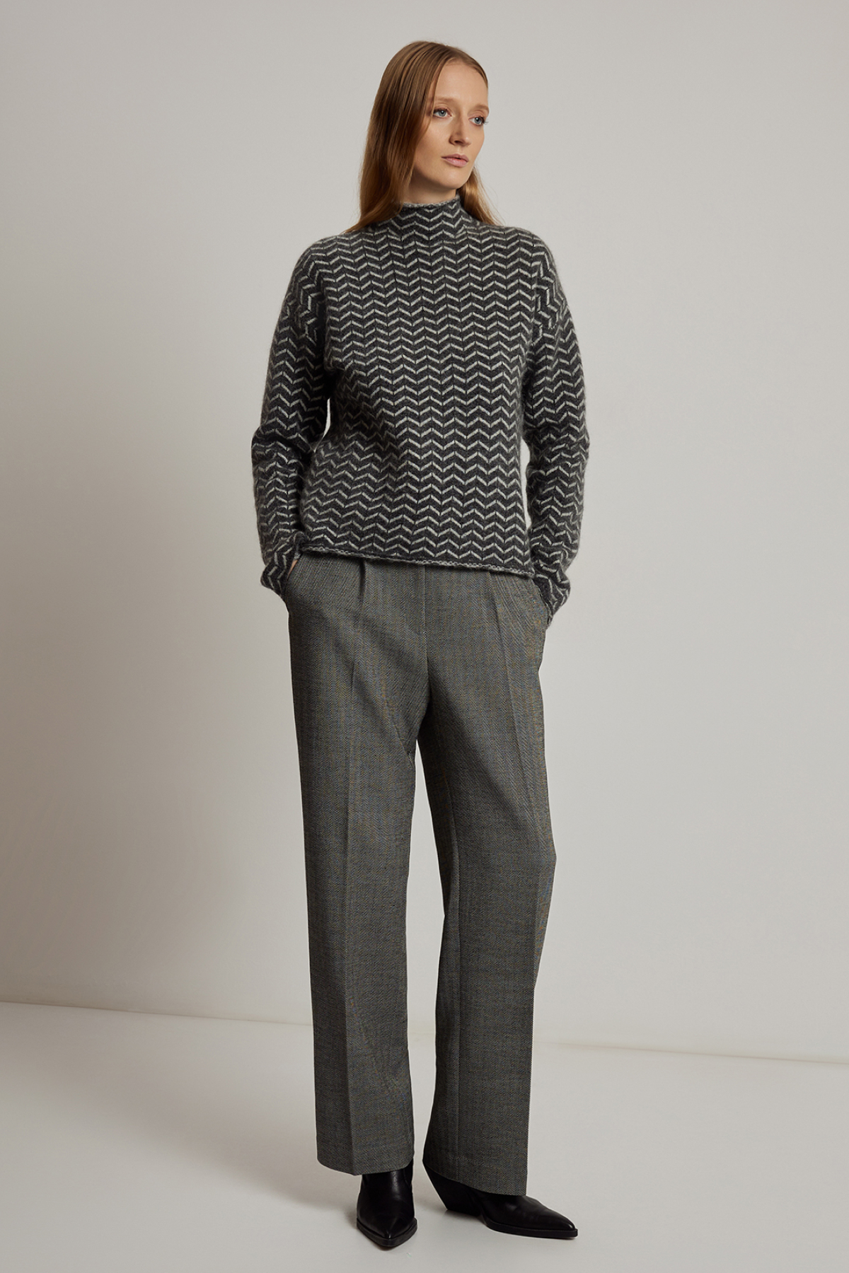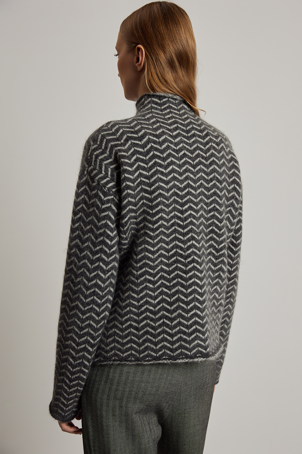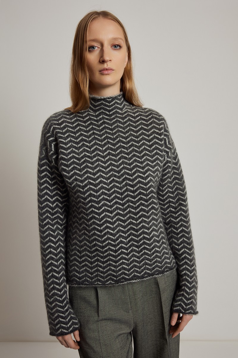 Бесшовный джемпер, выполненный из мягкого трикотажа с добавлением шерсти и мохера. Модель свободного силуэта со спущенным плечом и воротником-стойкой.