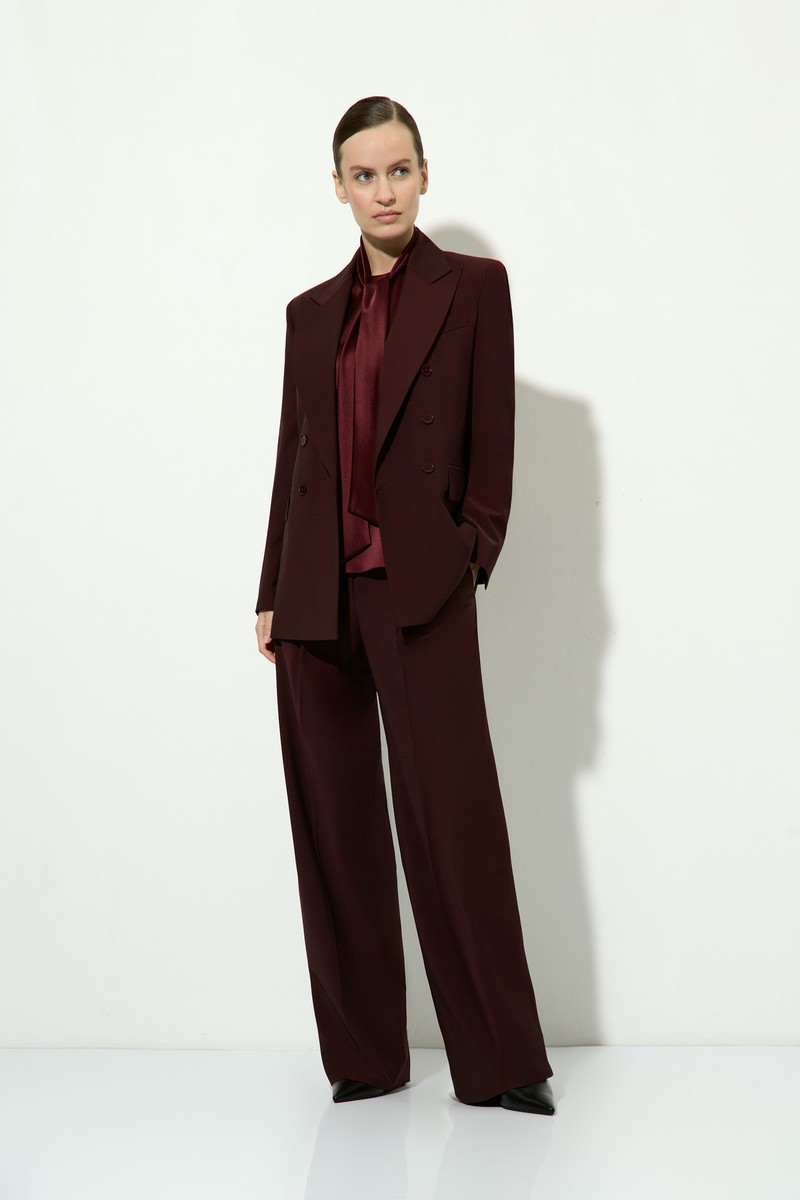 - костюмы с классическими брюками, брюками клеш, широкими брюками, брюками с высокой посадкой;